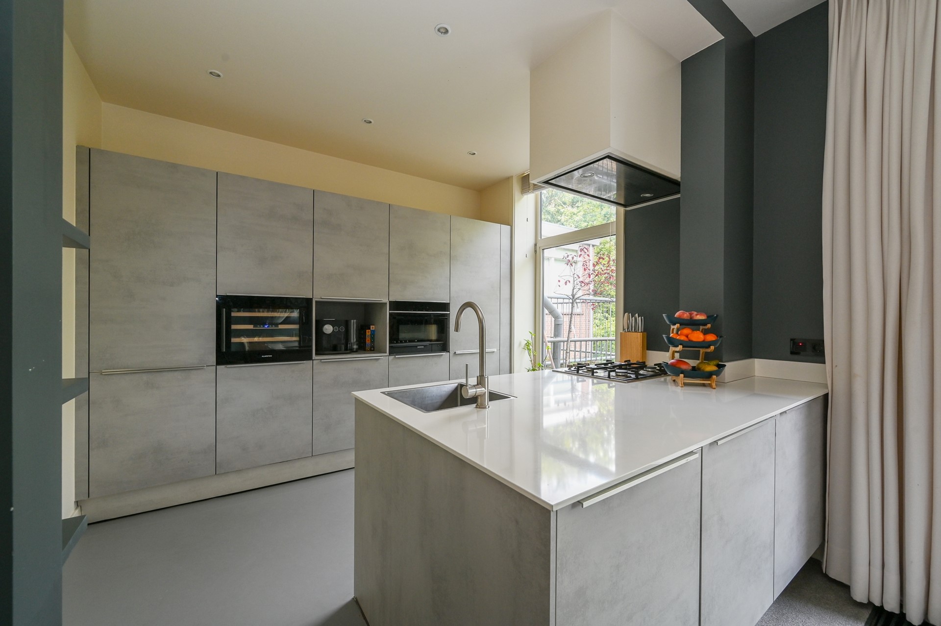 At the rear is the luxurious open-plan kitchen with an island and all the necessary built-in appliances. From the dining area, sliding doors open onto the 6.50x1.85m terrace with a stunning view of the Peace Palace. Here, you'll hear absolutely nothing of the city surroundings surrounding the property – truly unique!