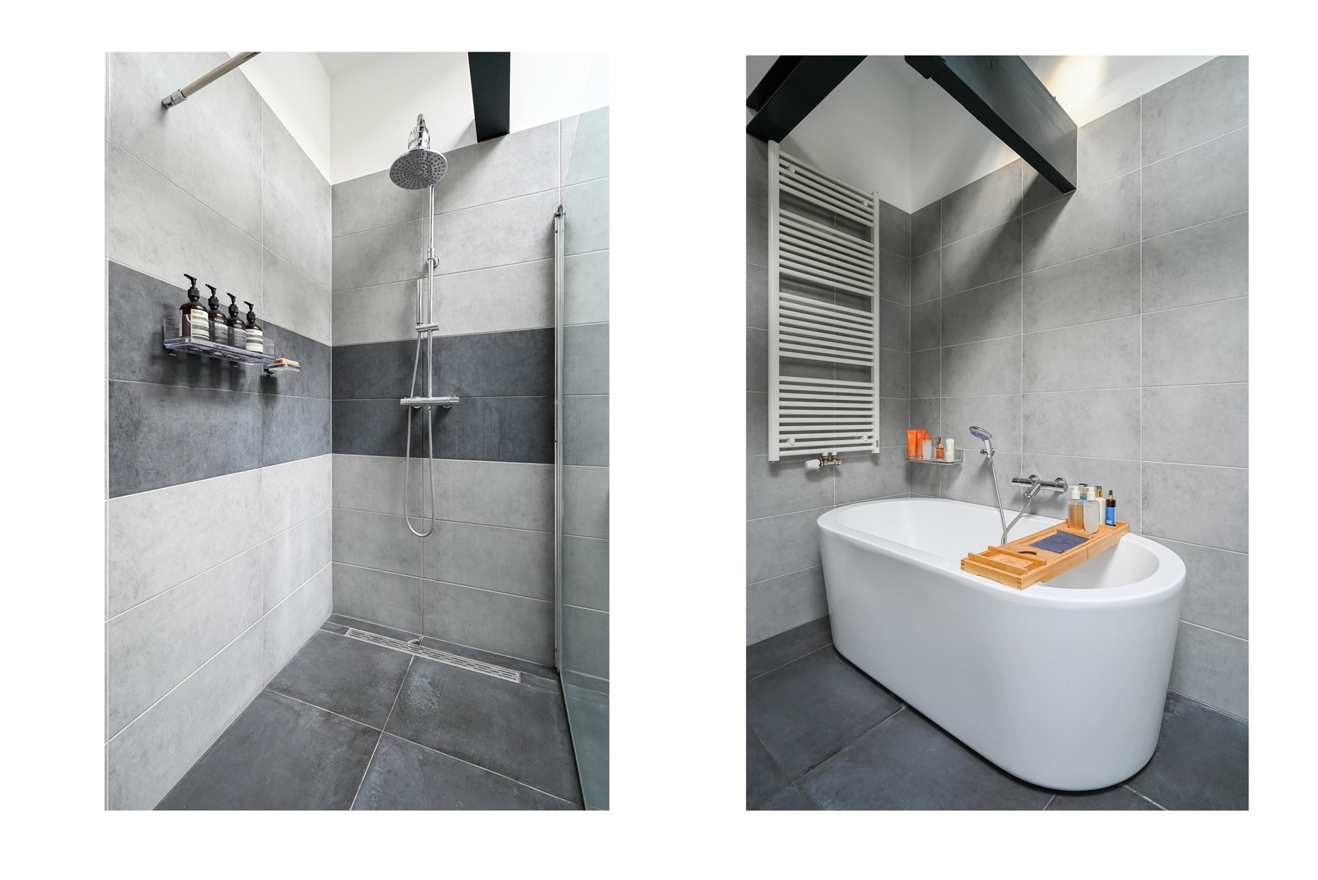 Spacious, luxurious, and bright bathroom with a bathtub, walk-in shower, second toilet, bidet, vanity, and pleasant natural light through the skylight. On the landing, two separate closets house the Vaillant central heating boiler, and the slightly larger closet offers ample storage space and houses the washing machine and dryer.