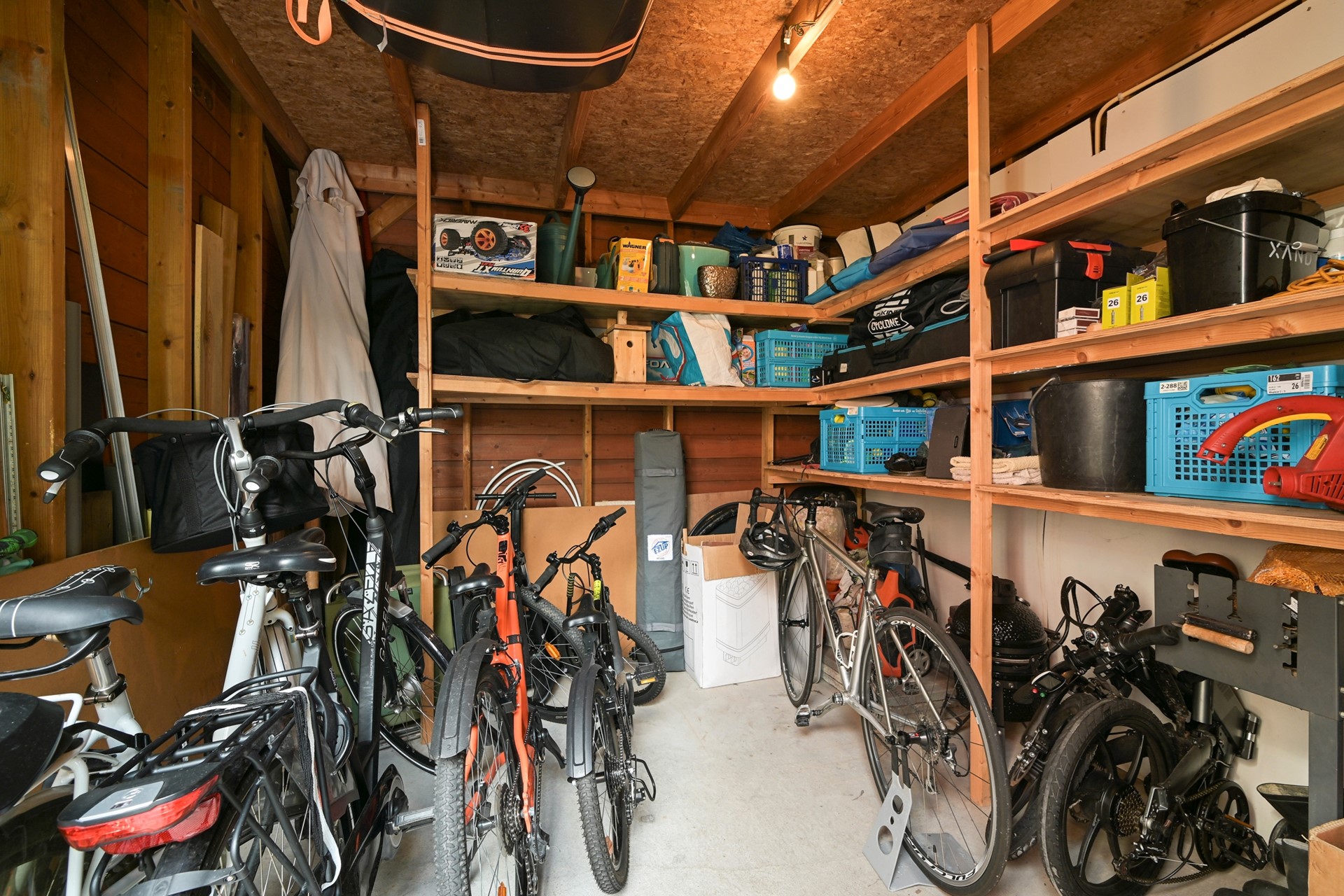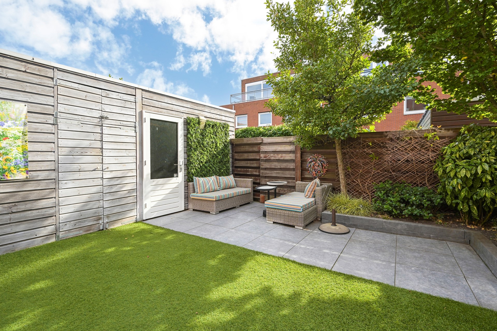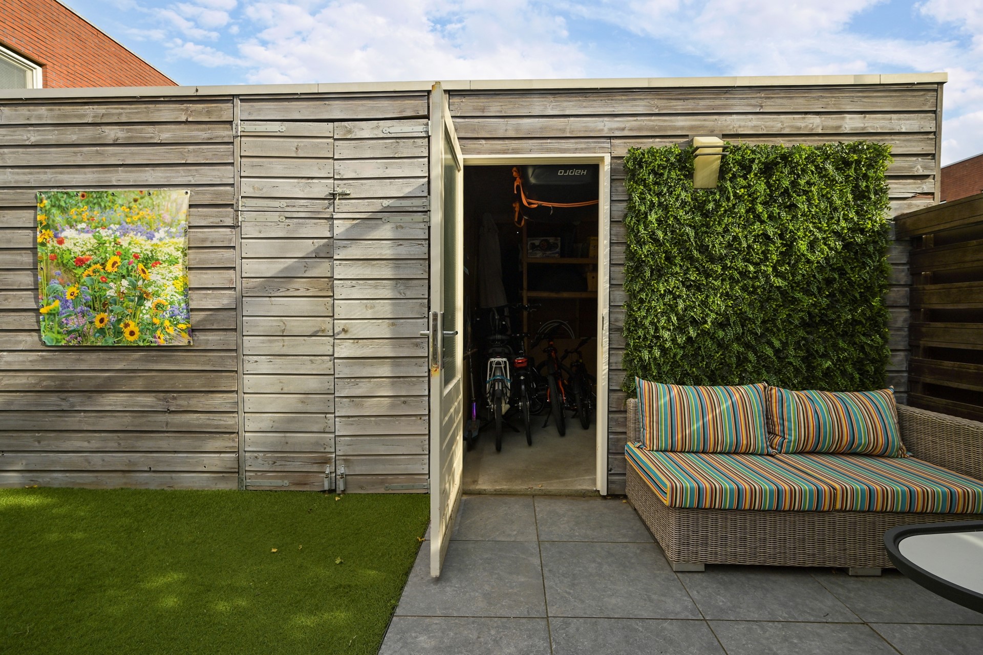 • Achtertuin van ca. 10 m diep en tot 7,70 m breed, gelegen op het zuidoosten, met zonnescherm, ruime berging, afgesloten containerplek en achterom