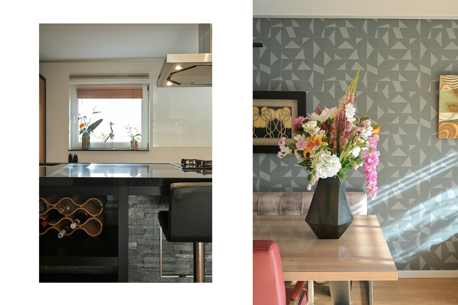 De woonkamer beslaat de volledige breedte (7,55 m) en is heerlijk licht dankzij de grote raampartijen. Aansluitend bevindt zich de royale open woonkeuken in schiereilandopstelling met barfunctie en een extra diep natuurstenen werkblad (ca. 1,20 m). Tijdens het koken heb je zicht op de bar, eettafel en tuin.
