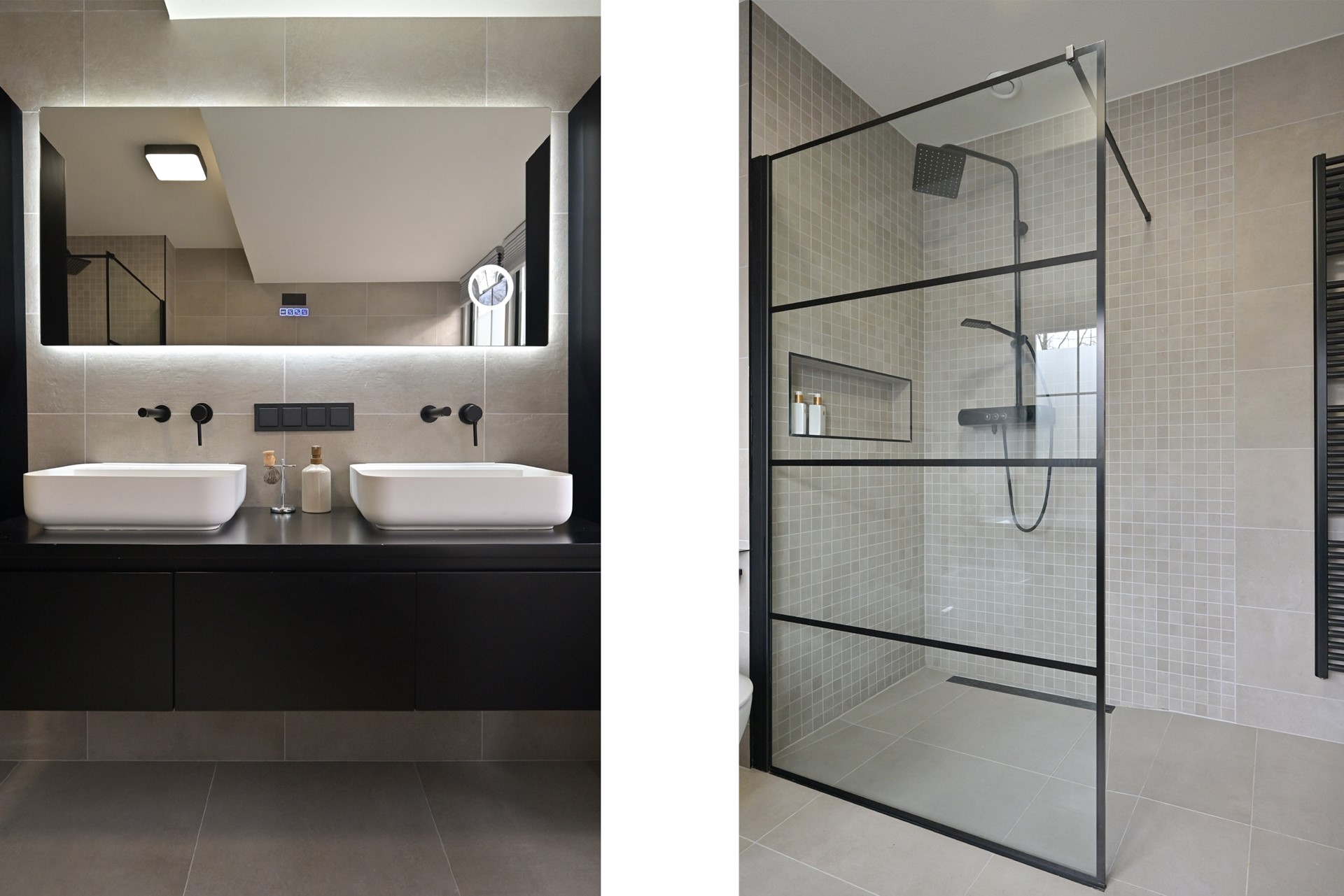 Centrale overloop, toilet met fontein, 2 slaapkamers en een badkamer met ligbad en dubbele wastafel. Royale masterbedroom met kleedkamer en eigen badkamer met ligbad, douche, toilet, bidet en dubbele wastafel.