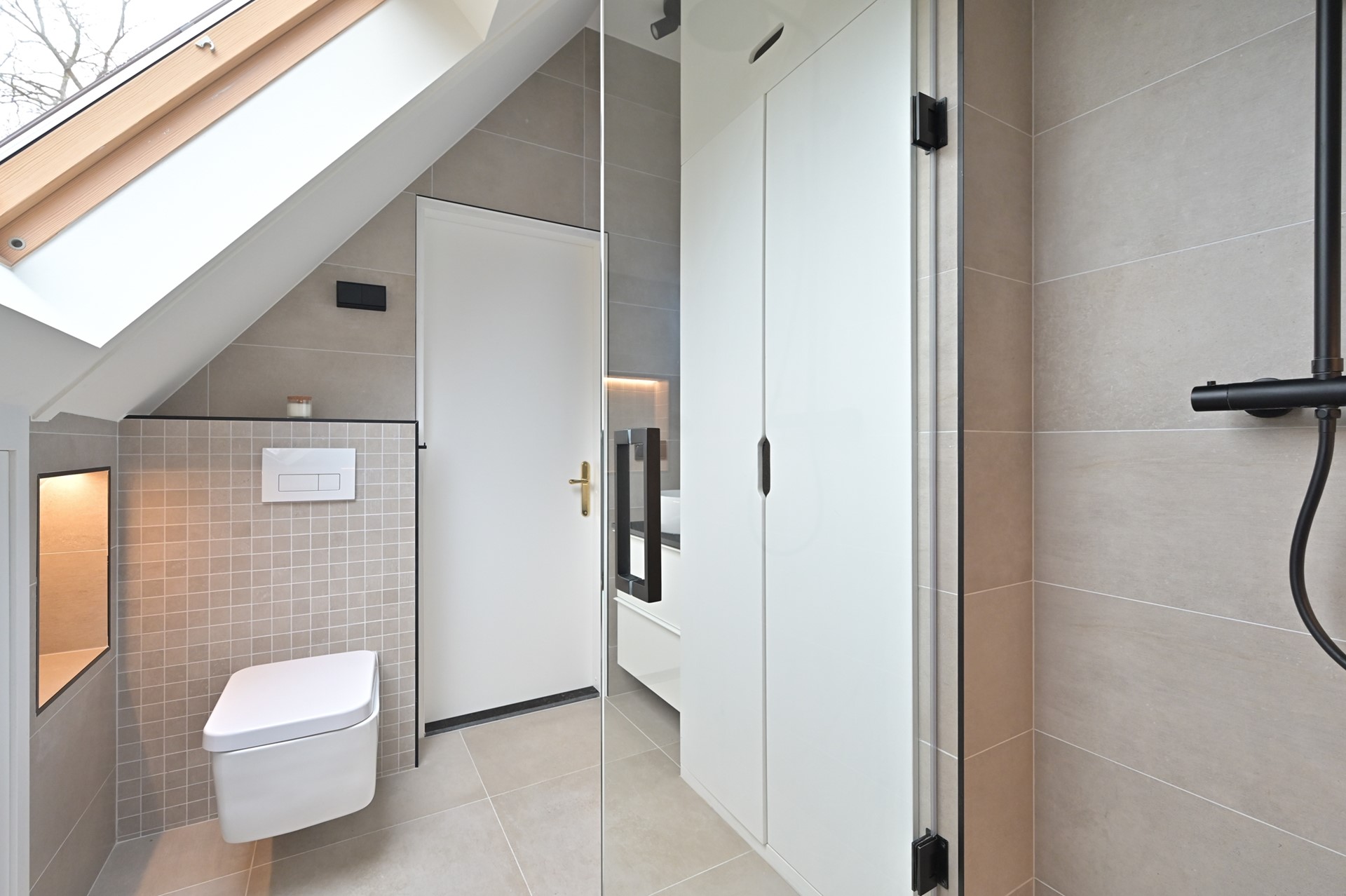 Overloop met toegang tot de 7e slaapkamer met Veluxraam en eigen badkamer met douche, wastafel, toilet en eveneens een Veluxraam. In deze ruimte ook een kast met opstelplaats CV combiketel Nefit CW6 uit 2023.